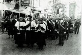 Each May at the feast of the Virgin, the street was festooned with red, white and green electric lights, food stands were set up and for several nights there was music. Festivities culminated with a Mass that ended with a procession of the statue of the Madonna Help of Christians. This life-size likeness was carried from the church on a high platform amidst a discharge of fireworks, and the crowds would gasp at the beauty of the statue with roses in its crown, decked in jewels and trailing long streamers on which people pinned money. The procession included clergy, altar boys carrying candles and incense, girls wearing white dresses with blue sodality mantles, and women dressed in black, some carrying banners, others walking in their bare-feet. Leading the procession were a police escort and a band. Serious men with their sashes and canes, passed between throngs of people lining sidewalks, as the musical refrain “Viva Maria, Maria Viva!” was sung again and again.